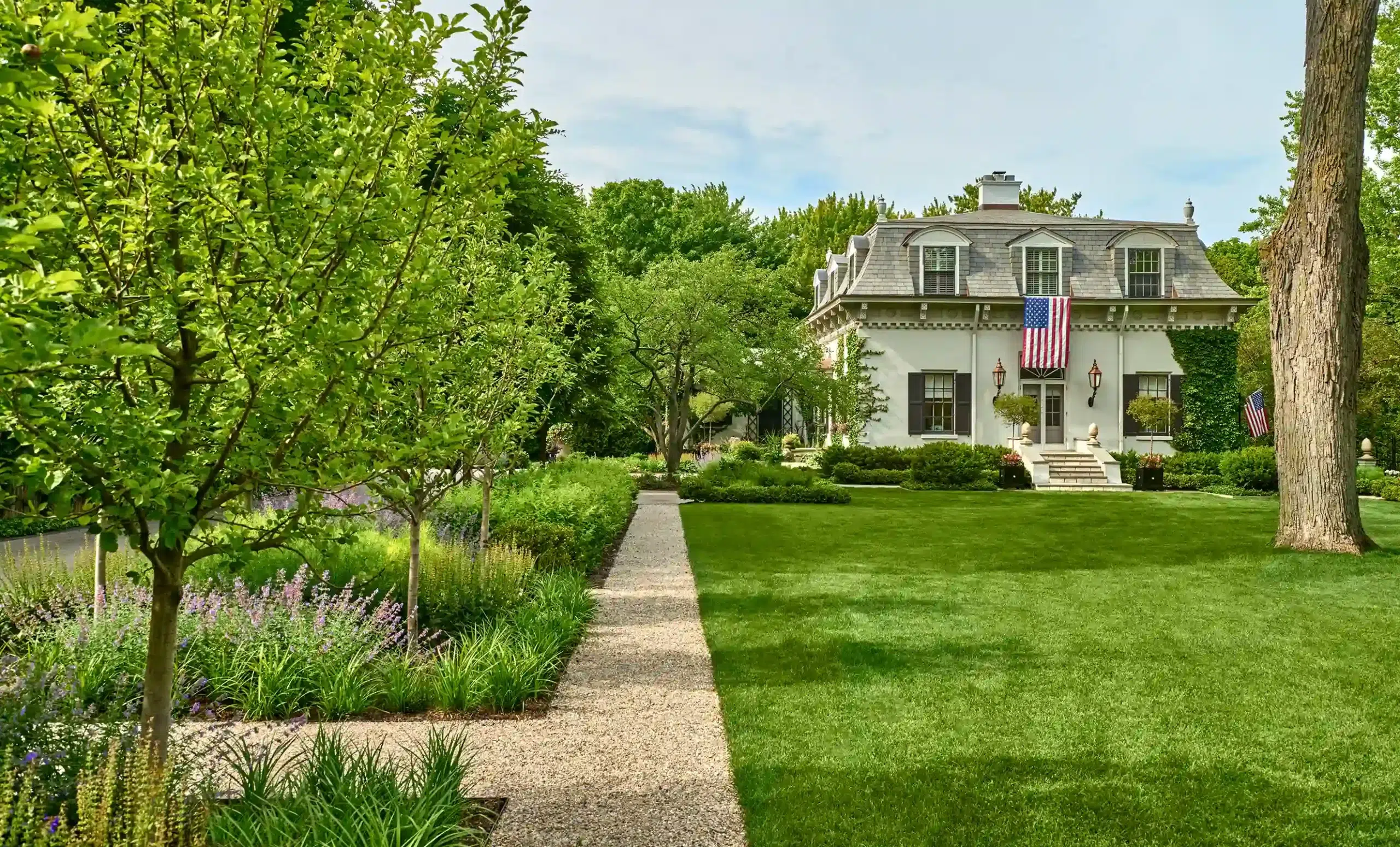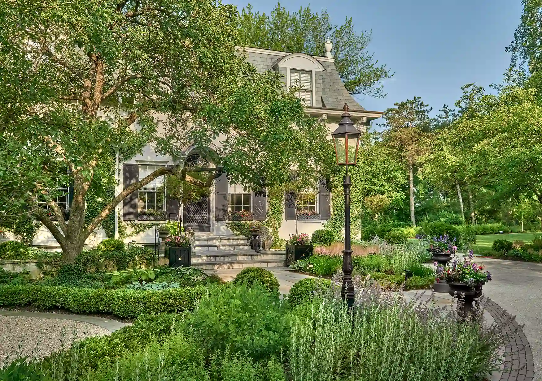 The landscape surrounds a historic 1869 David Adler carriage house that’s set back from a busy road which leads to a popular beach. With a steady flow of beachgoers passing by–particularly during the warmer months–the client’s vision was to capitalize on the large front lawn space and create a more traditional context, embrace the community by inviting views in. This required a major redesign that included Buckthorn removal, addition of a fountain, the framing of the front lawn with symmetrical gravel paths, the planting of perennial gardens, apple orchards, and finally the creation of patio spaces where family and friends can enjoy watching the world go by–their favorite thing to do on a lazy summer afternoon. With an architect and an interior designer in residence, remaining true to the scale and architectural tradition of the coach house remained a priority throughout.