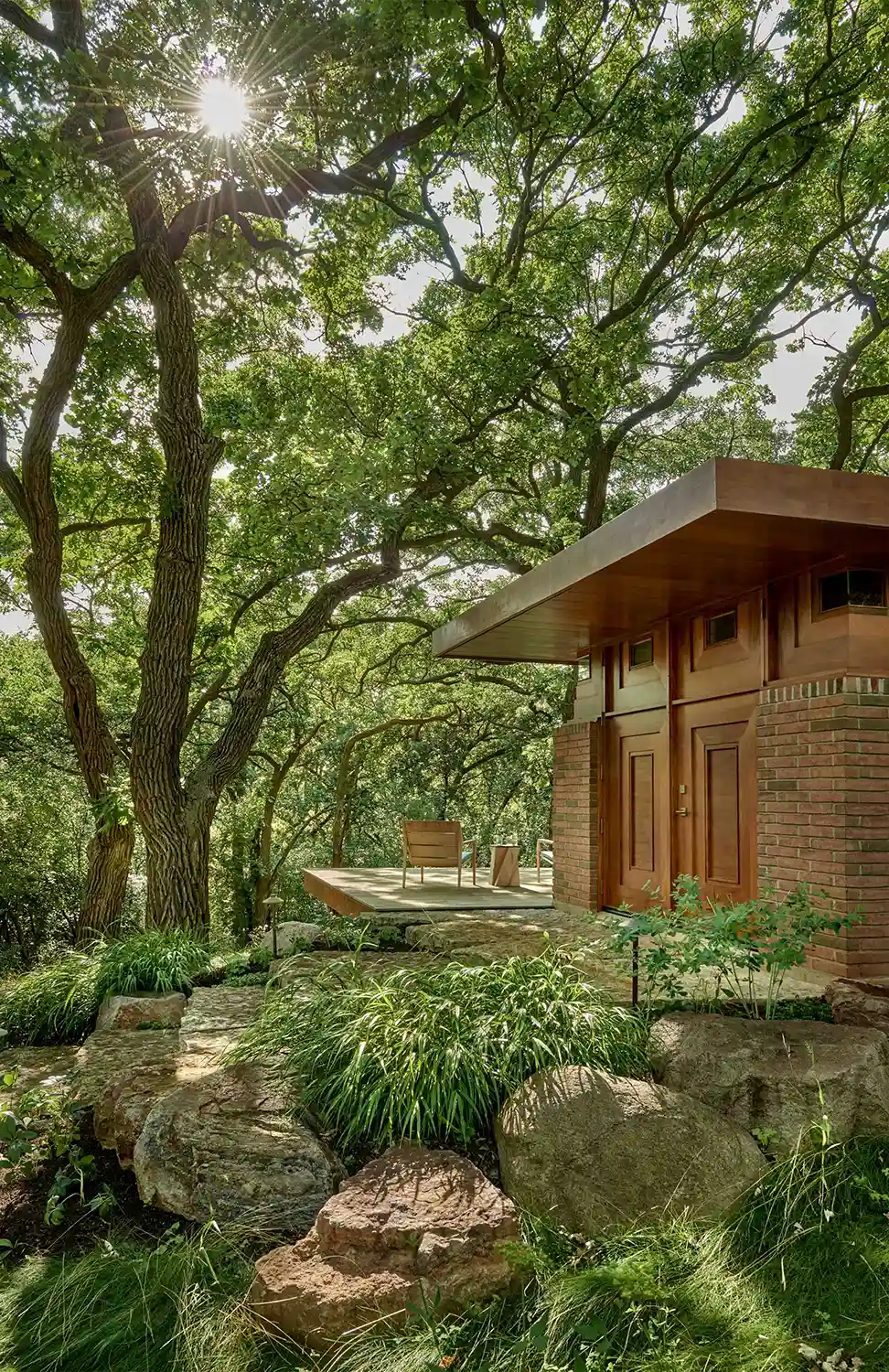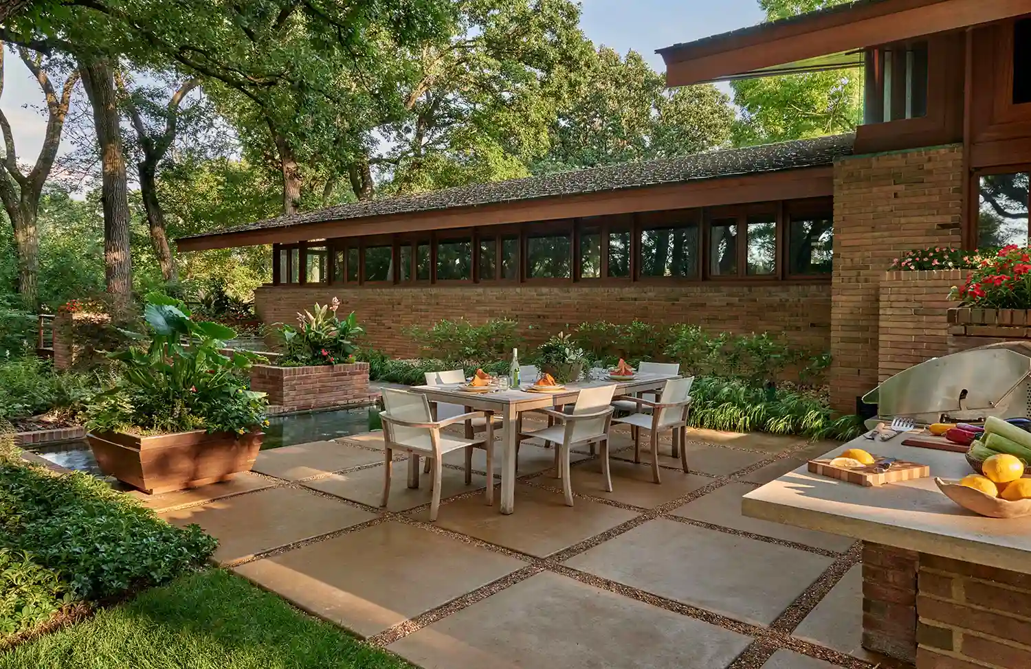 Keeping Wright’s vision at the forefront, the landscape design complements the property’s architectural lines. A renovated patio’s horizontal lines echo Wright’s design principles, leading visitors toward an outdoor dining area adjacent to a newly rejuvenated frog pond. Staying true to the client’s desire for a rebirth of color and life saw the extensive clearing of invasive species, replaced by swathes of tall fescue meeting Kentucky bluegrass. These carefully chosen plantings respected the prairie-style architecture while introducing a palette of textures and hues that revitalized the property’s aesthetic.